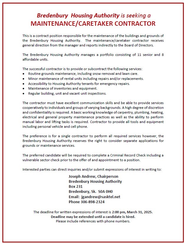 The Town of Bredenbury is accepting resumes for the position of Public Works Position. Wage is based on public works pay scale that can be provided to applicant. The more experience and certifications you have the more your starting wage is. Overtime is paid on over 8 hours a day. Weekend water testing is paid on overtime hours.